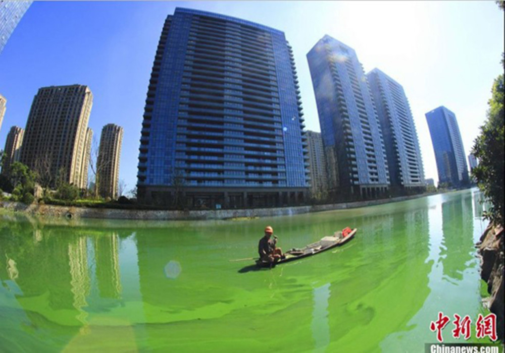 2013年7月24日,浙江紹興,由于污染嚴重導致水質惡化,每年夏季柯橋瓜渚湖都會爆發藍藻。2012年藍藻大爆發時,直接導致10多萬斤養殖魚死亡。今年入夏以來,也有數千斤魚類死亡,由于魚類死亡太多,因此今年漁民不再放養魚苗。