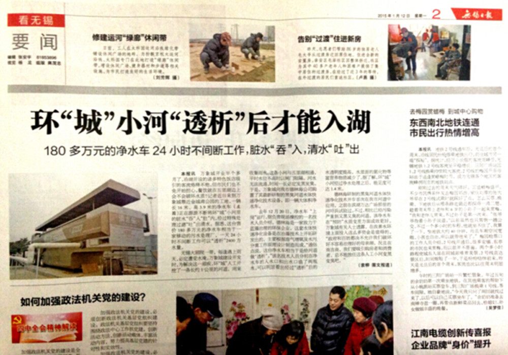 (2015年1月21日)無錫萬象城開業了,開發商在環萬象城挖了一條環城河道,因為河水不流通,時間一長就發黑發臭,為此萬象城向我公司購置了最新研制的黑臭河道水體快速凈化設備(即清水車)。此車是由我司研究開發、設計制造的國內首輛水體快速凈化,污水處理量可達2400方/天,該車具有機動靈活、快速高效的特點,為城鄉黑臭河道、庫塘湖泊、景觀水體的治理增添了有力手段。無錫日報2015年1月12日2版頭條詳細報道了此事。