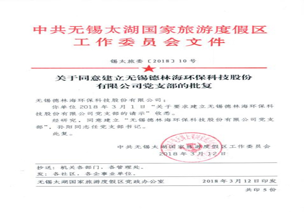 目前,公司共有正式黨員6人。黨支部建立后,公司將不定期組織召開黨員大會、進(jìn)行黨員教育、開展民主生活會,做好黨的方針政策的宣傳工作,為全體員工提供精神指引和力量源泉,也為傳遞黨的理念提供有利基礎(chǔ)和條件。今后,公司將充分發(fā)揮黨支部戰(zhàn)斗堡壘作用和黨員先鋒模范作用,加強(qiáng)自身建設(shè),充分凝聚廣大黨員的力量,團(tuán)結(jié)和組織群眾,形成強(qiáng)大的合力,為公司規(guī)范、持續(xù)、健康發(fā)展提供堅強(qiáng)的組織保障。我們相信,隨著無錫德林海環(huán)保科技股份有限公司黨支部的成立和黨員隊(duì)伍的不斷壯大,在這些優(yōu)秀黨員同志的帶領(lǐng)下,公司的明天將會更加美好!