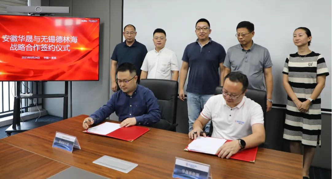 2023年8月24日,無錫德林海環保科技股份有限公司(以下簡稱“德林海”)與新能源行業異質結領軍企業安徽華晟新能源科技有限公司(以下簡稱“安徽華晟”)在宣城簽署戰略合作框架協議。雙方將在光伏異質結項目的組件生產、電池銷售、技術服務、海外市場推廣等方面進行合作。德林海副總經理洪駿與安徽華晟董事長徐曉華代表雙方簽署了合作協議。德林海董事會秘書李曉磊、財務總監季樂華,安徽華晟副總裁孫令軍、董事會秘書金玲等出席簽約儀式。