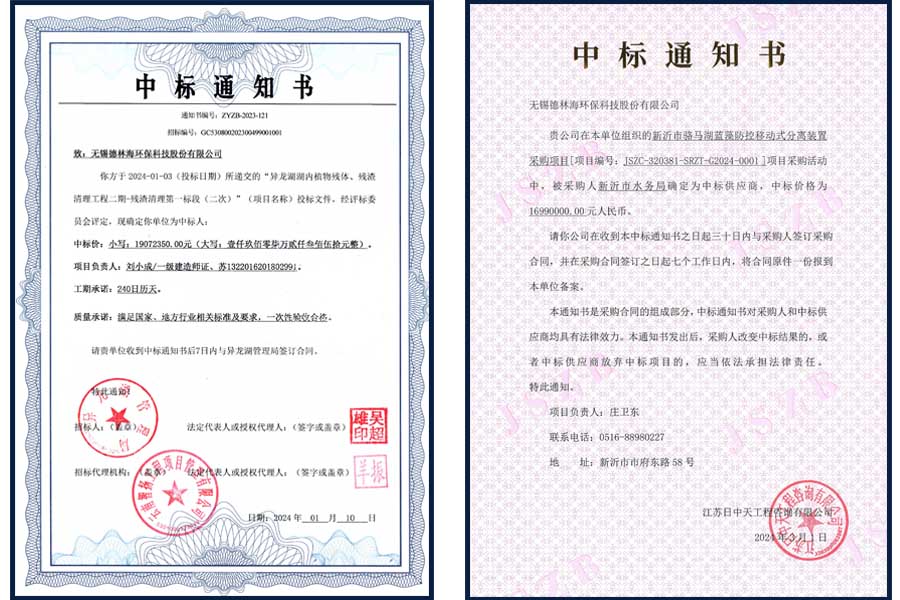 卯兔辭舊歲,辰龍迎新春,隨著2024年的到來,德林海迎來了一個雙喜臨門的開頭。新年伊始的首季,公司連續中標異龍湖湖內植物殘體、殘渣清理工程二期-殘渣清理第一標段(簡稱“異龍湖清淤項目”)和新沂市駱馬湖藍藻防控移動式分離裝置采購項目(簡稱“駱馬湖項目”)。這兩個項目的中標為德林海帶來了總計3606萬元的合同。