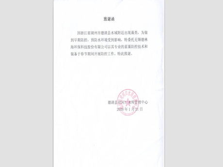 近日,我司收到了一封來自浙江省湖州市德清縣對河口水庫管理中心的致謝信。感謝我司在今年特殊的春節期間開展的藍藻防控工作。