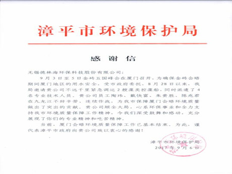 2017年9月3日至5日金磚五國峰會在廈門召開。日前,漳平市環境保護局給我司發來感謝信,對我司不遠千里、緊急救急表示感謝。